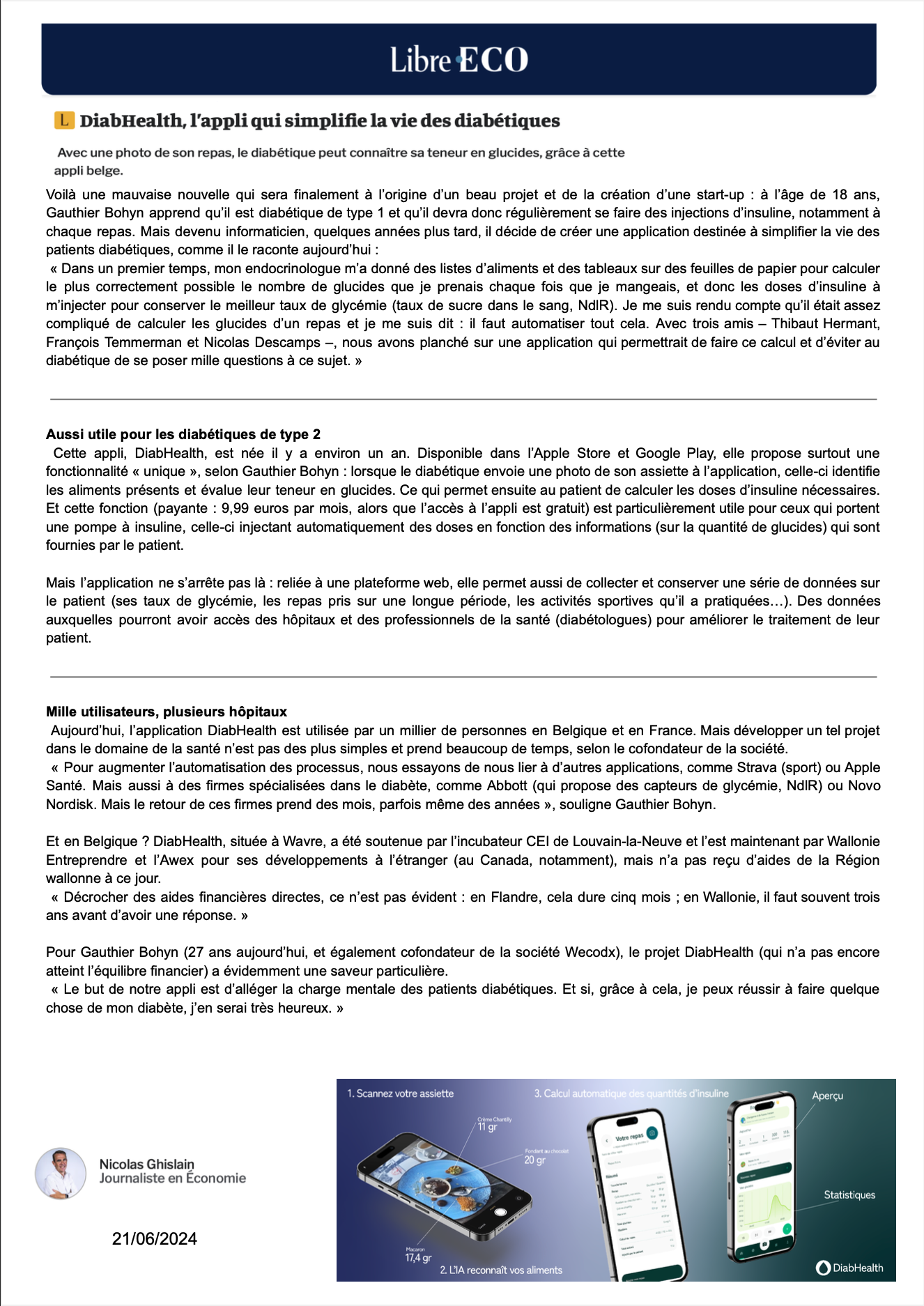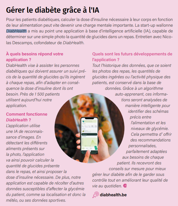 Diagnostiqué diabétique de type 1 à 18 ans, Gauthier Bohyn a décidé de créer, avec ses associés, une application capable de simplifier le quotidien des patients. Grâce à l’intelligence artificielle, DiabHealth permet d’évaluer instantanément les glucides présents dans un repas à partir d’une simple photo. Connectée à une plateforme web, l’app facilite aussi le suivi médical et l’analyse des données de santé. Déjà utilisée par plus de 1 000 patients et soutenue par plusieurs structures d’innovation, DiabHealth poursuit son développement en Belgique, en France et au Canada.