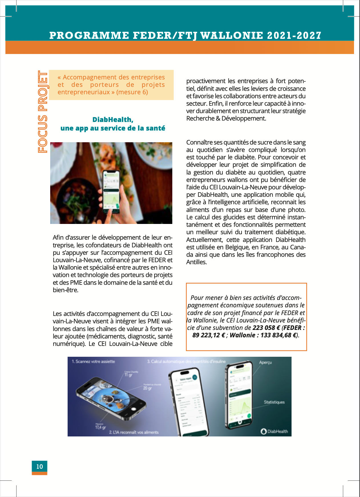 Grâce à l’accompagnement du CEI Louvain-la-Neuve, cofinancé par le programme FEDER/FTJ Wallonie 2021-2027, les fondateurs de DiabHealth ont pu développer une application mobile innovante au service des personnes diabétiques. Utilisant l’intelligence artificielle pour reconnaître les aliments et calculer instantanément les glucides, DiabHealth facilite le suivi du traitement au quotidien. Déjà utilisée en Belgique, en France, au Canada et dans les Antilles, cette solution illustre parfaitement la capacité d’innovation des PME wallonnes dans le secteur de la santé.